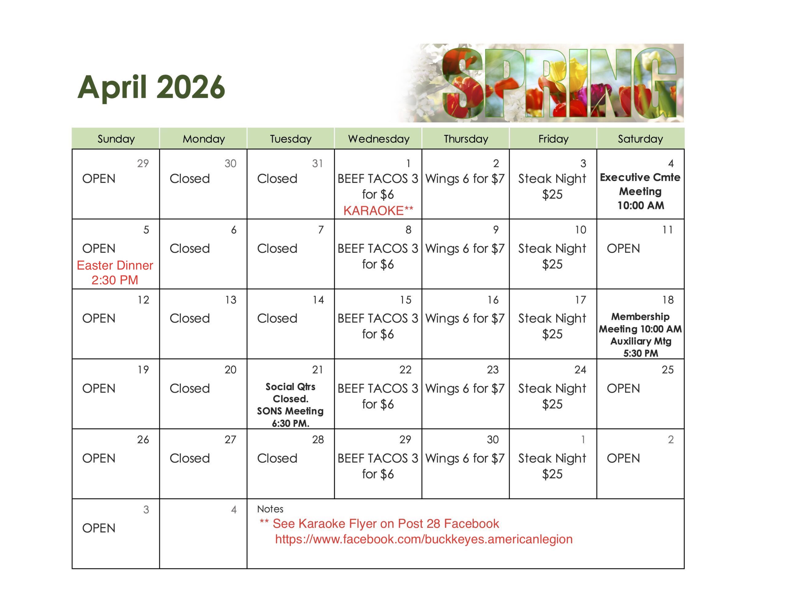 Sunday April 5th Easter Dinner starting at 2:30pm: $15 eat in, $20 takeout. Includes ham, turkey, sweet potatoes, green beans, stuffing, mac and cheese, roll, dessert.
